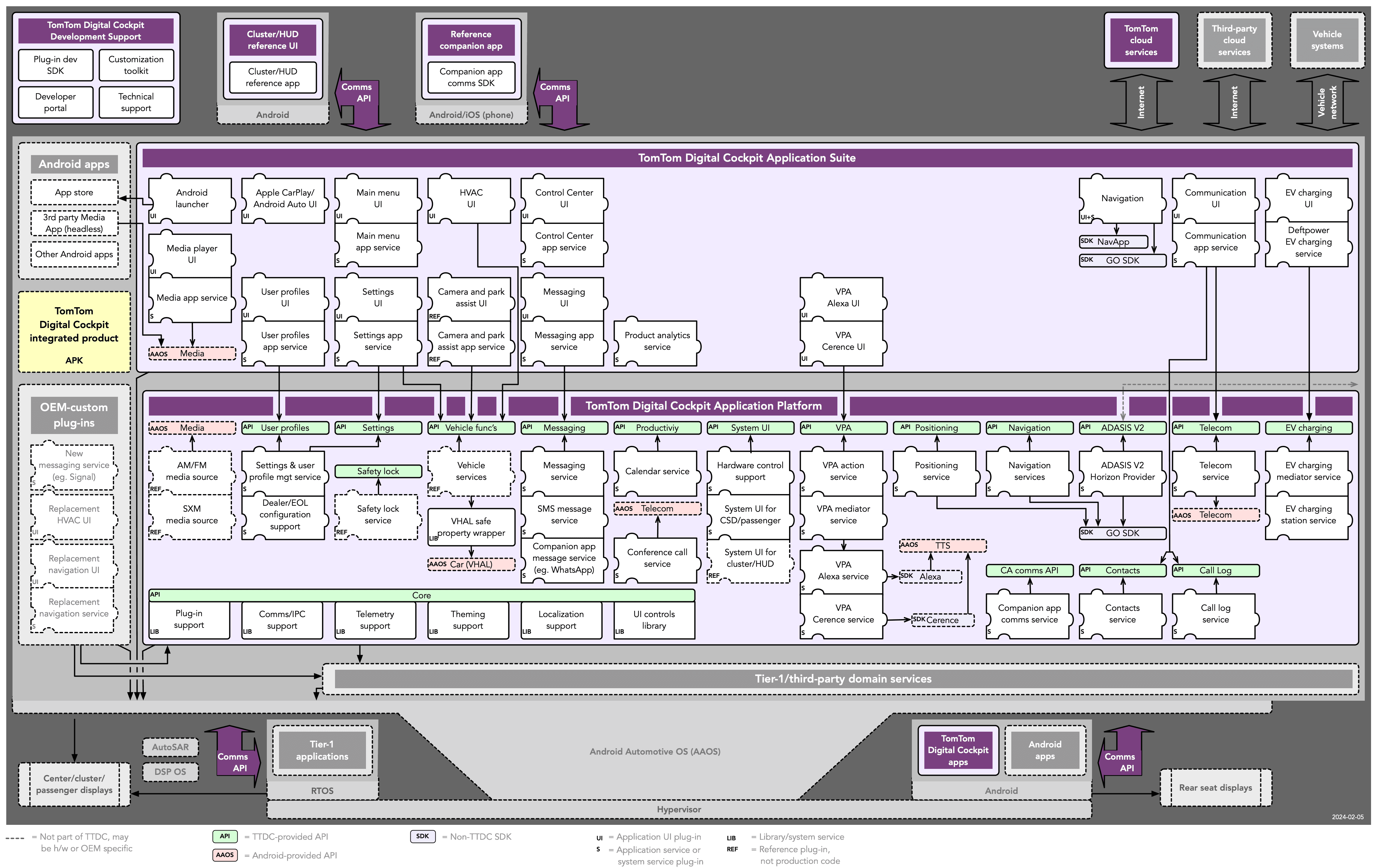 The following diagram shows everything that’s included in TomTom Digital Cockpit, all off-the-shelf components (purple colored) and how these relate to other software in a vehicle.