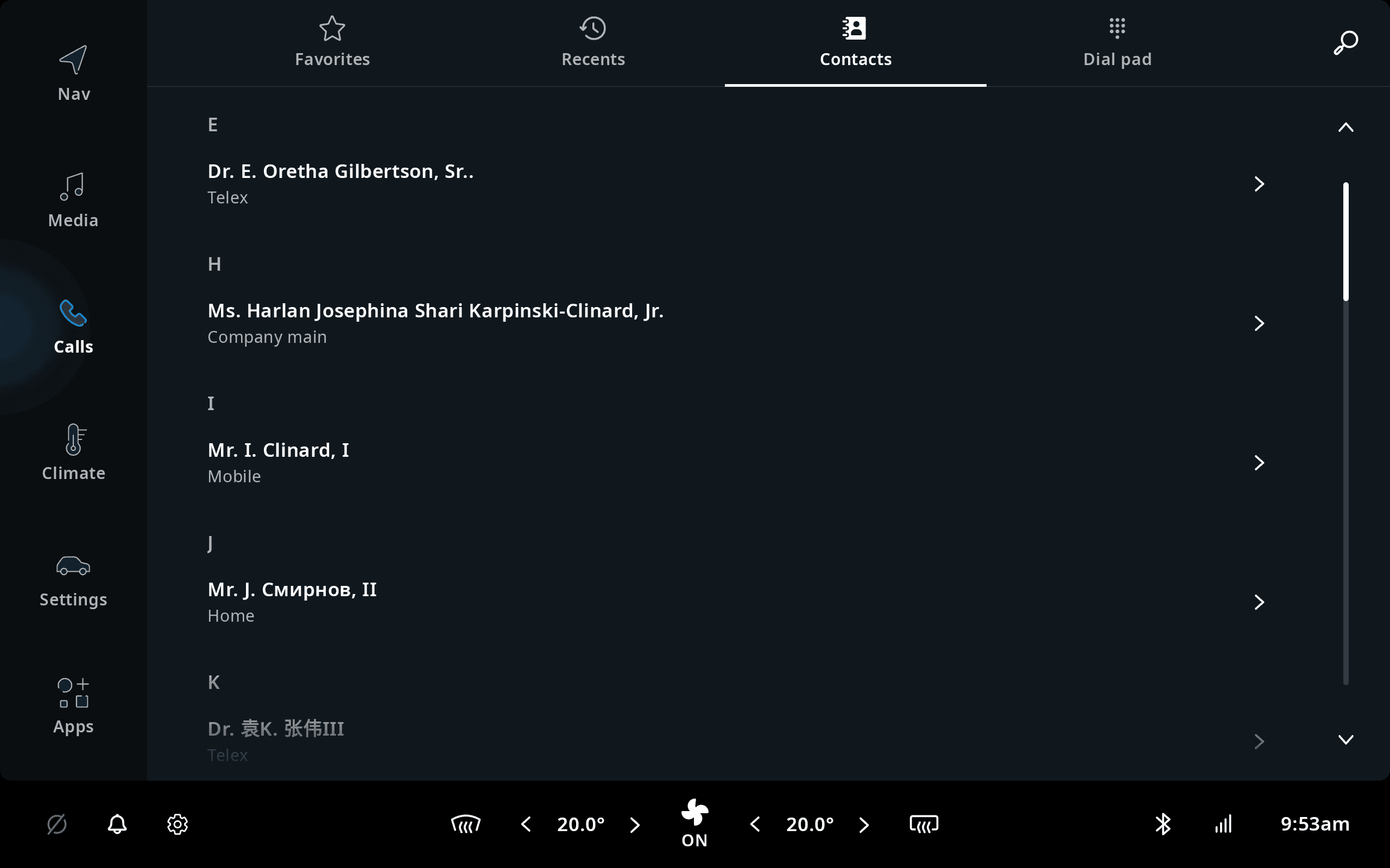 The calls application in TomTom Digital Cockpit, provides functionality to make and receive phonecalls through a mobile phone that is paired to TomTom Digital Cockpit via Bluetooth. Once a mobile phone is paired, the contact list will sync with the TomTom Digital Cockpit IVI system. Then the contacts will be accessible under the Contacts tab, which allows the user to select a contact and make a phonecall.