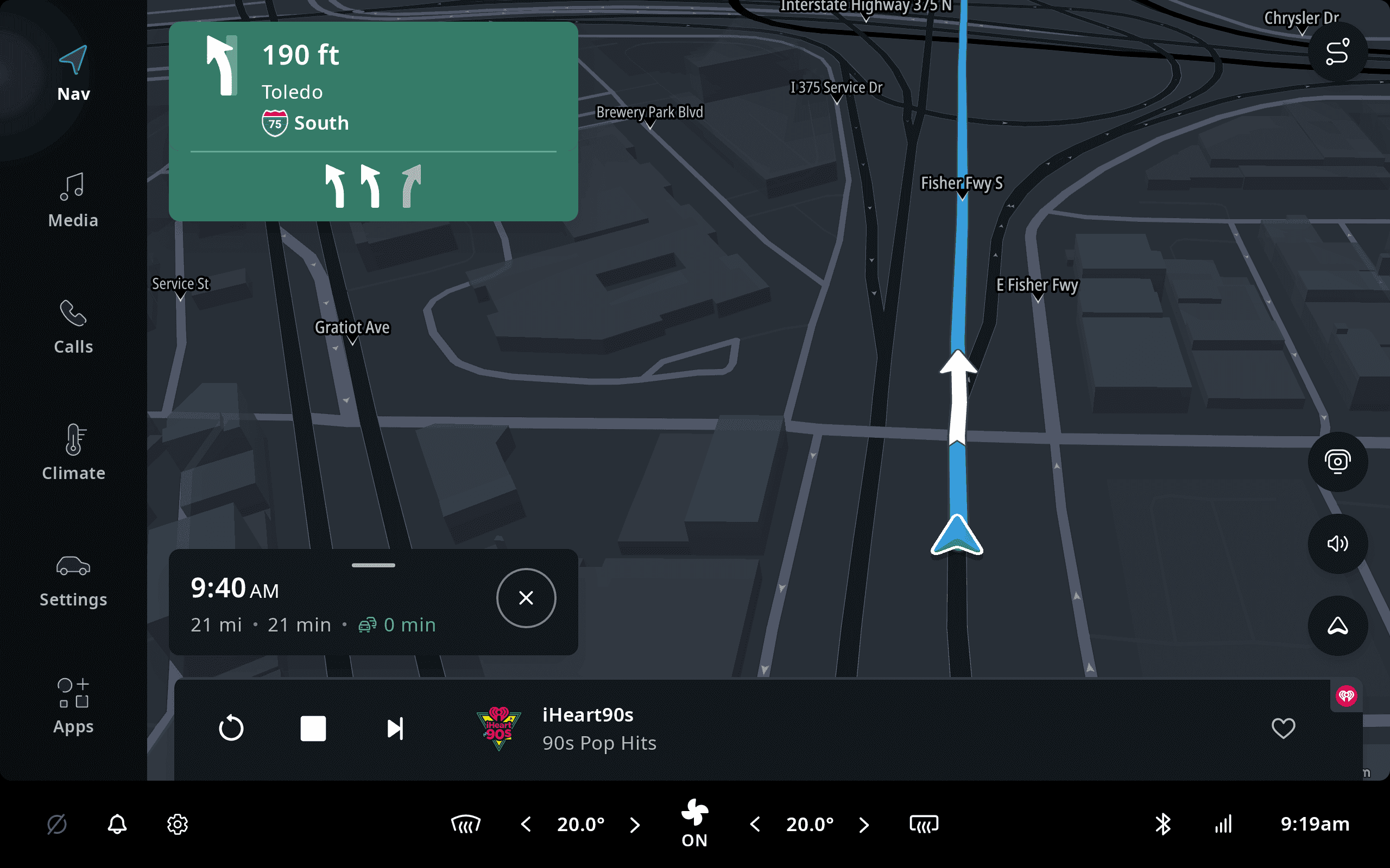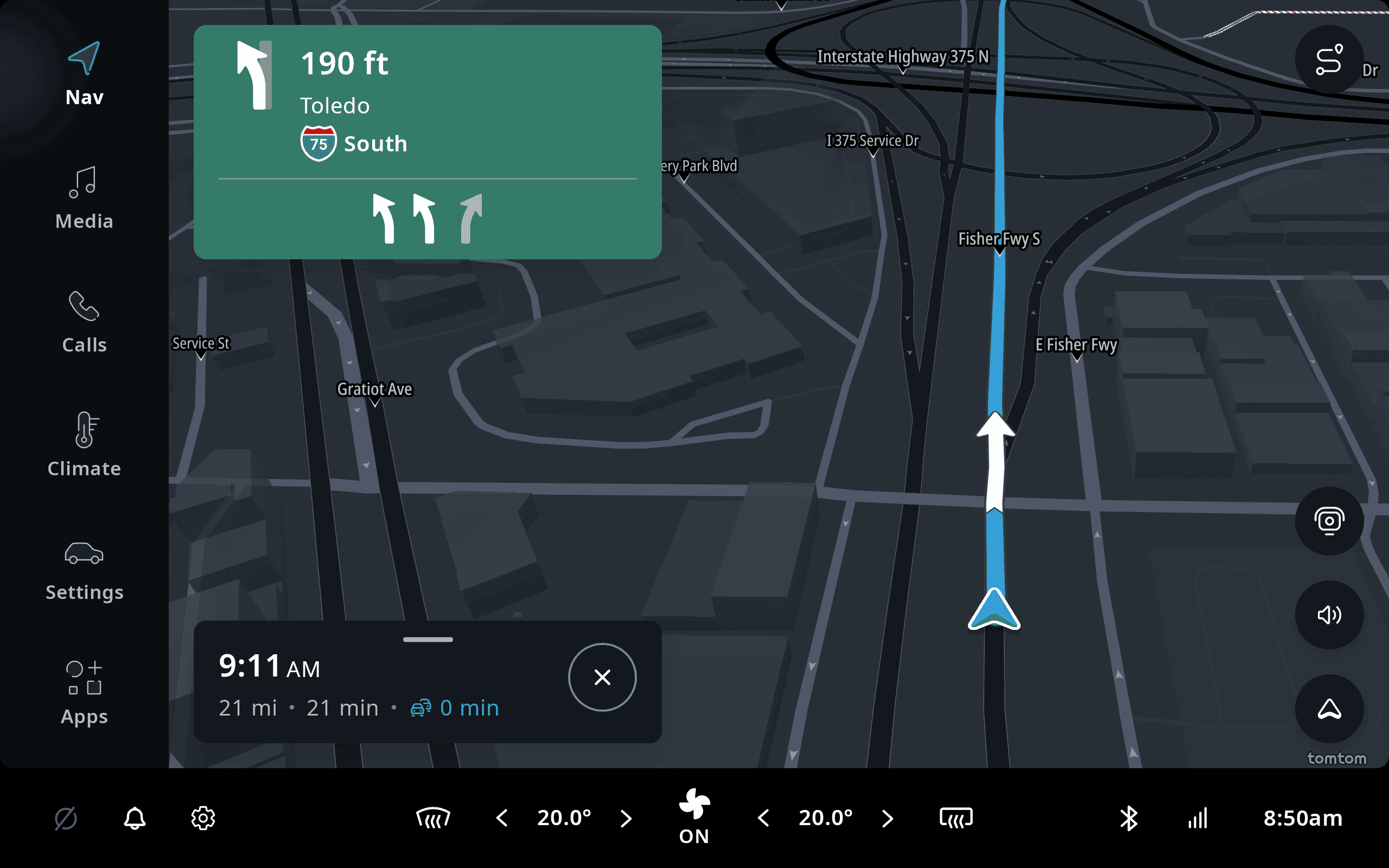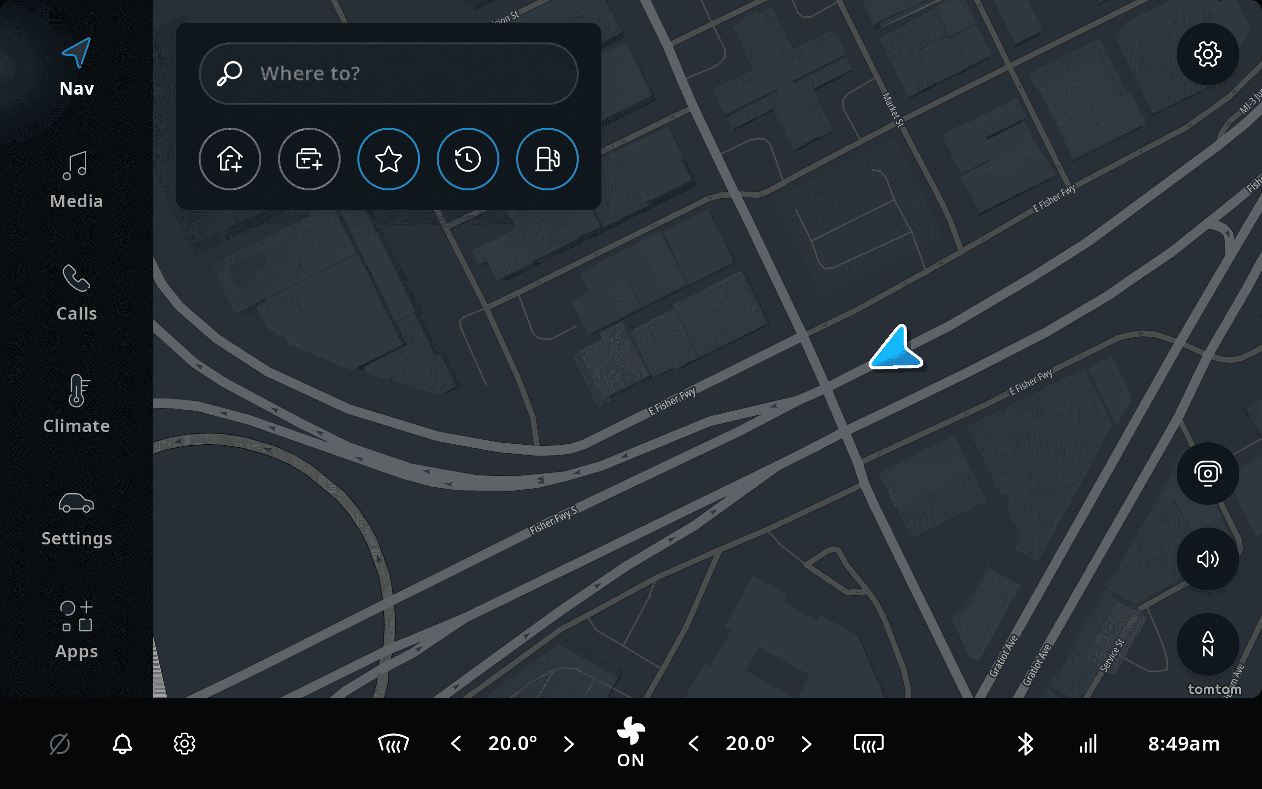 The contents of the map view will vary depending on your current location. The screen of the TomTom Digital Cockpit system is divided into a few different areas. The background contains the map, which provides navigation functionality, with search, route guidance, traffic information and so on. The main menu is on the left-hand side, which allows access to other functionality of the platform and ability to always return to navigation. Along the bottom there is a statusbar, including the Climate Control Center, which contains the Heating, Ventilation, and Air conditioning (HVAC) controls.