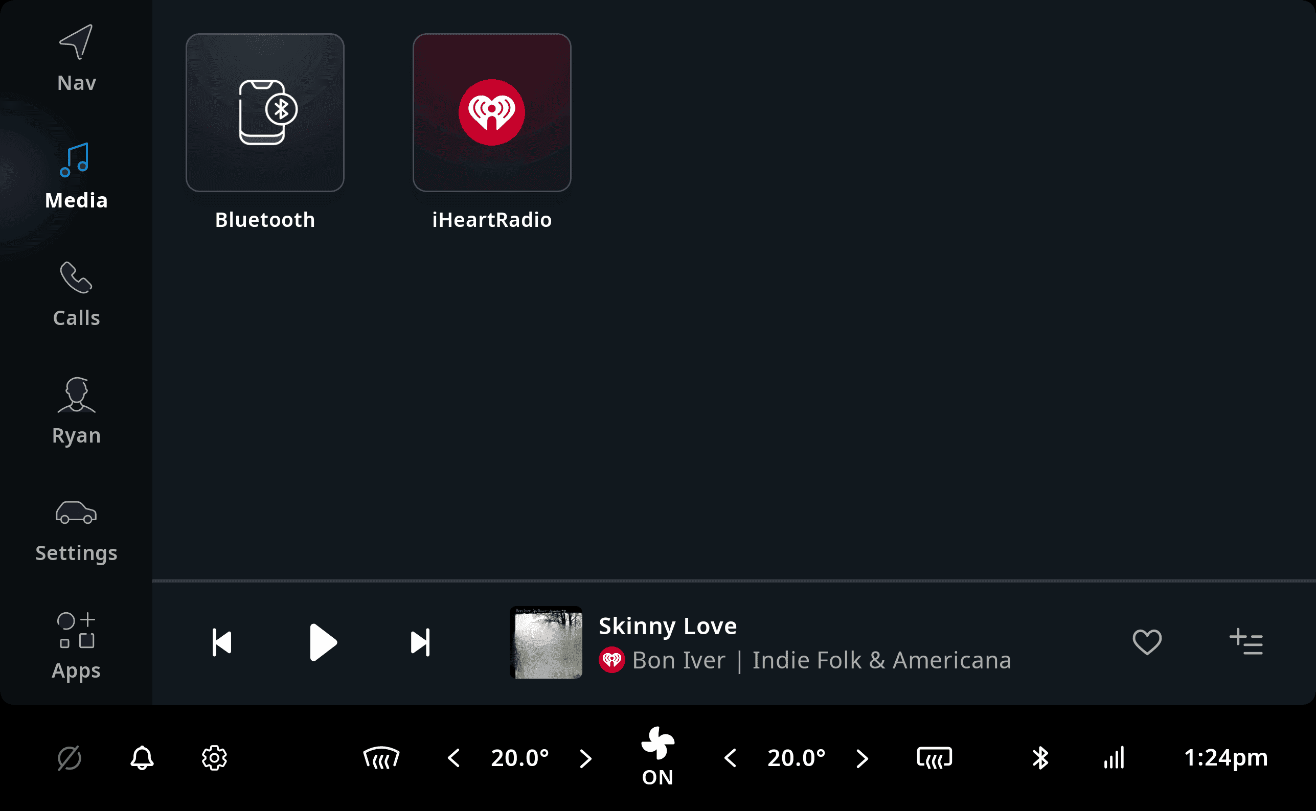 The media application in TomTom Digital Cockpit provides a framework for browsing and controlling audio content, provided by third-party media sources. The media source view in the media application lists all the currently available media sources on the device. You can see iHeartRADIO as a third-party media source on the device, and a paired mobile phone for BT audio streaming.