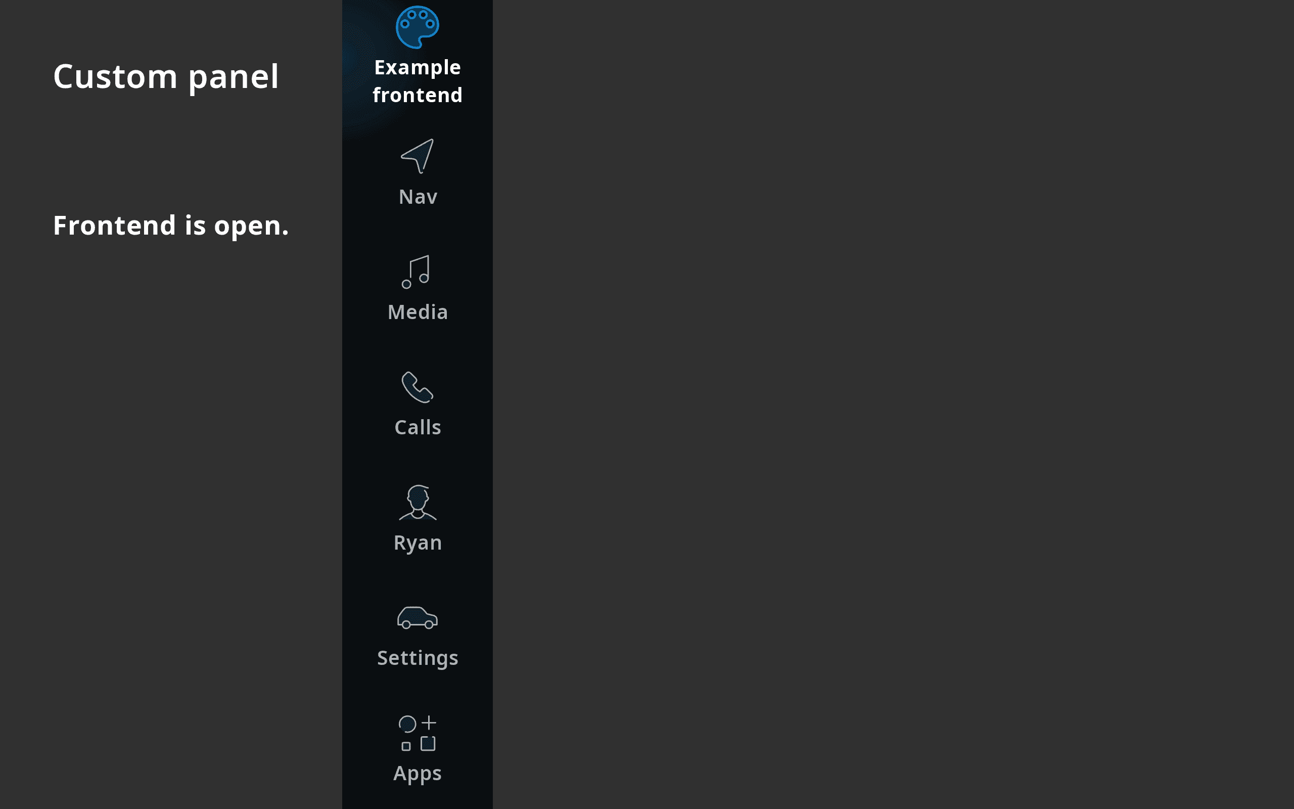 1internal class ExampleCustomPanel(2 frontendContext: FrontendContext,3 val isTaskPanelOpened: LiveData<Boolean>4) : CustomSystemUiPanel(frontendContext) {5 override fun createInitialFragmentInitializer(): IviFragment.Initializer<*, *> =6 IviFragment.Initializer(ExampleCustomFragment(), this)7}89internal class ExampleCustomFragment :10 IviFragment<ExampleCustomPanel, ExampleCustomViewModel>(ExampleCustomViewModel::class) {1112 override val viewFactory: ViewFactory<*>? =13 ViewFactory(TtiviCustompaneltypeCustompanelBinding::inflate)14}1516internal class ExampleCustomViewModel(panel: ExampleCustomPanel) :17 FrontendViewModel<ExampleCustomPanel>(panel) {1819 val isTaskPanelOpened = panel.isTaskPanelOpened20}