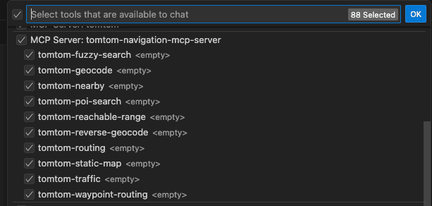 You can see the TomTom MCP tools in the GitHub Copilot tools menu.
