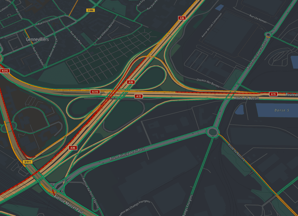 Various styles are available for the display of traffic data. They can be customized to suit specific needs. The TomTom Orbis Assets API documentation explains how to do this.