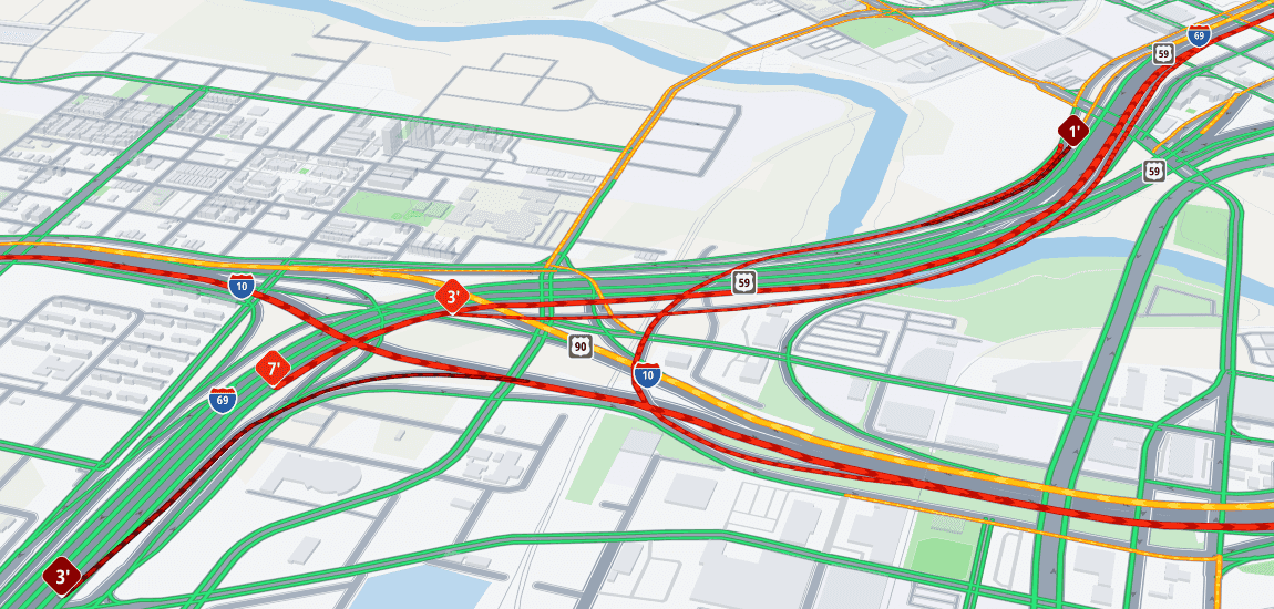- The severity of the current traffic condition with colored tubes indicating the delay severity.